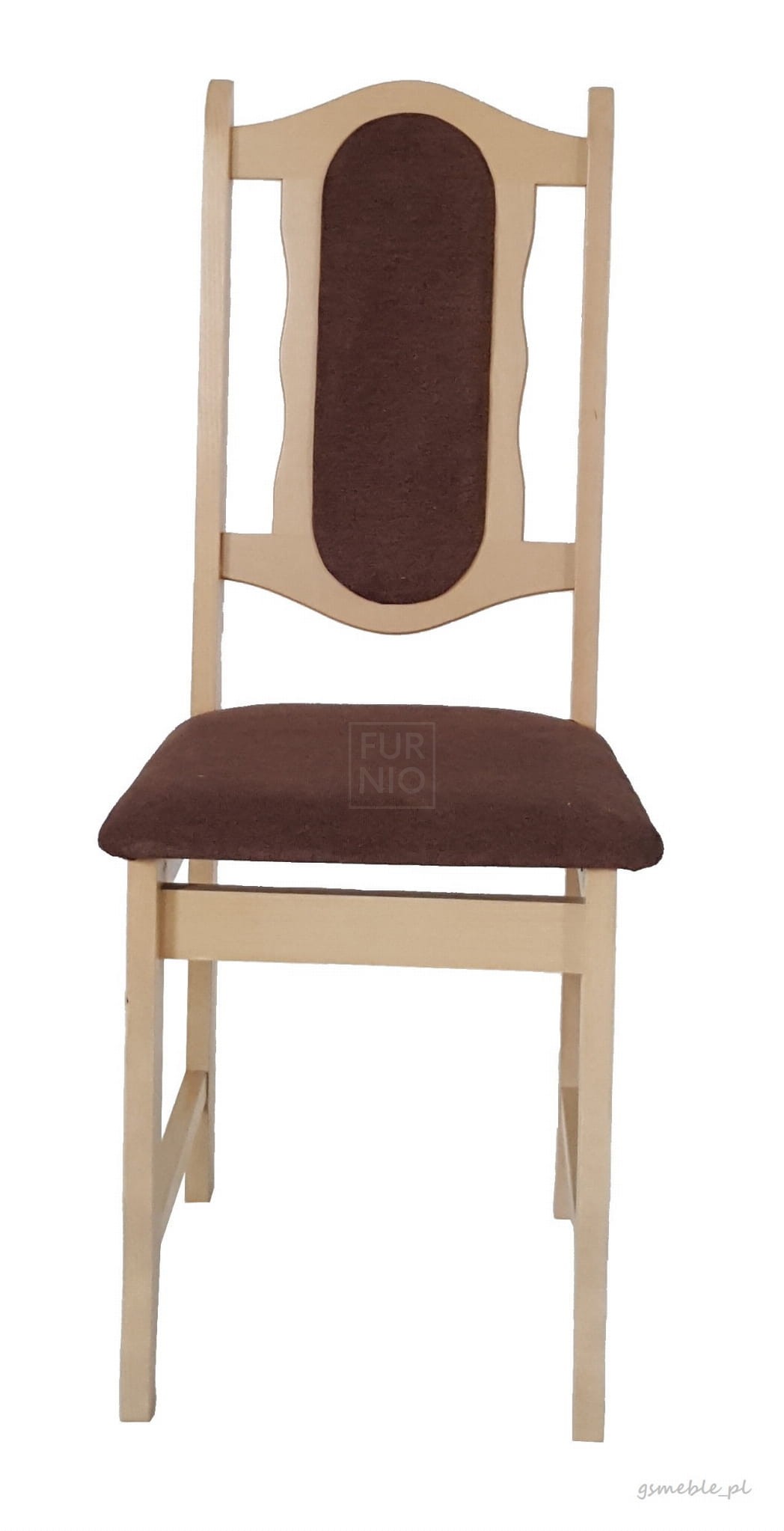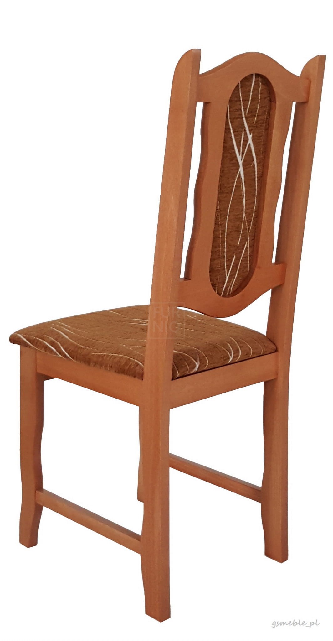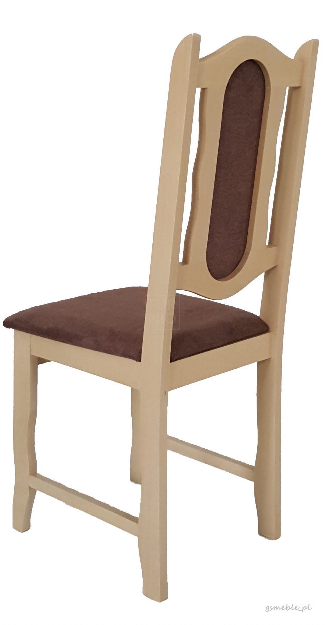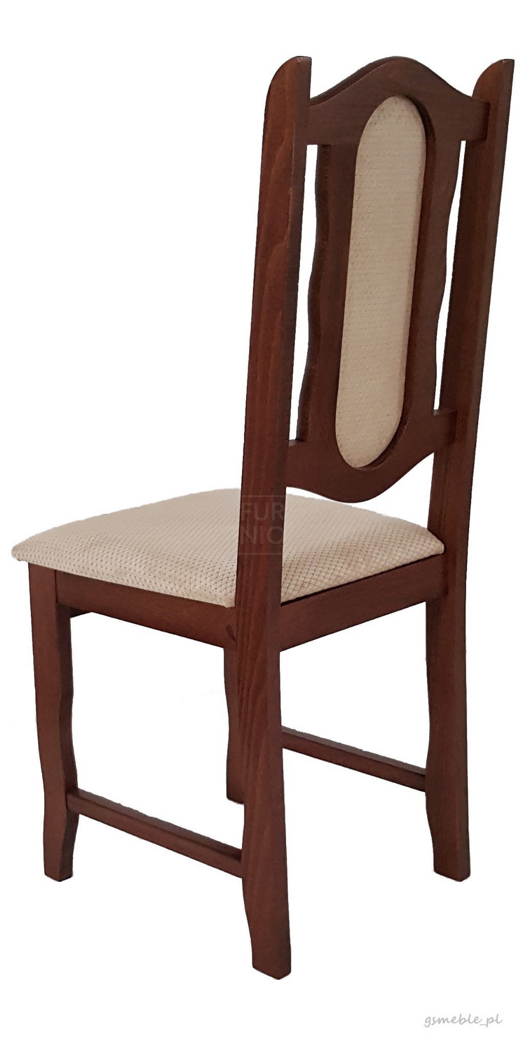 Stelaż wykonany jest z drewna bukowego, wykończonego bejcą i lakierem wodnym, co zapewnia trwałość oraz estetyczny wygląd. Wąskie, tapicerowane oparcie wyłożone pianką dodaje wygody i stylu.