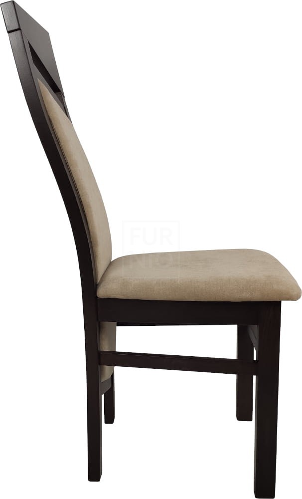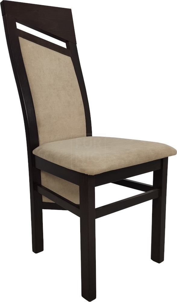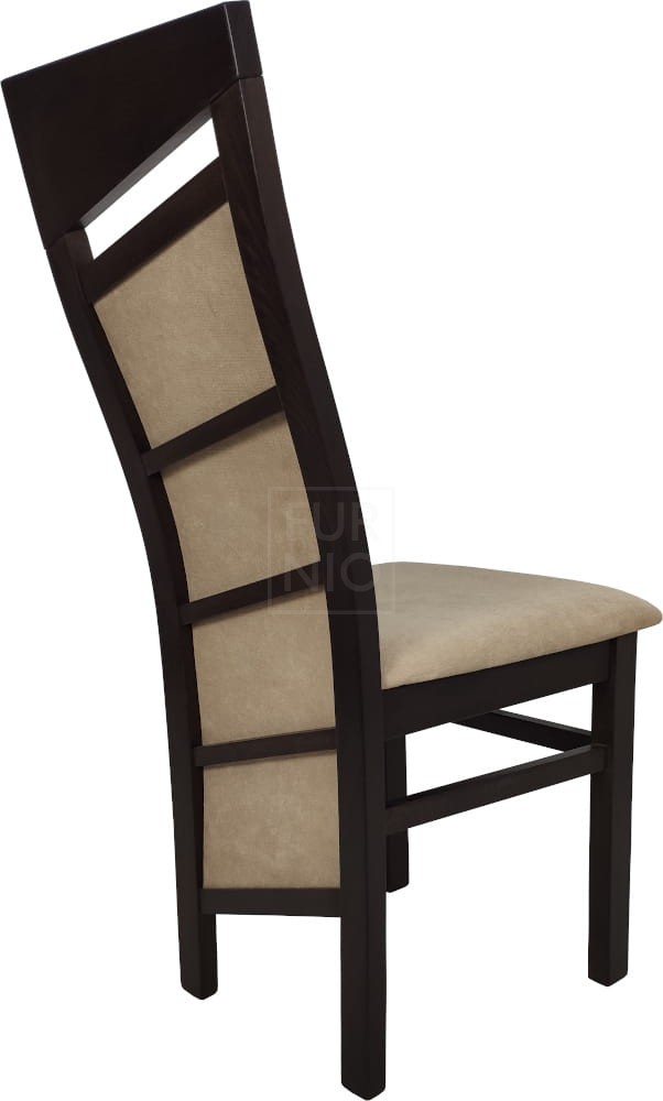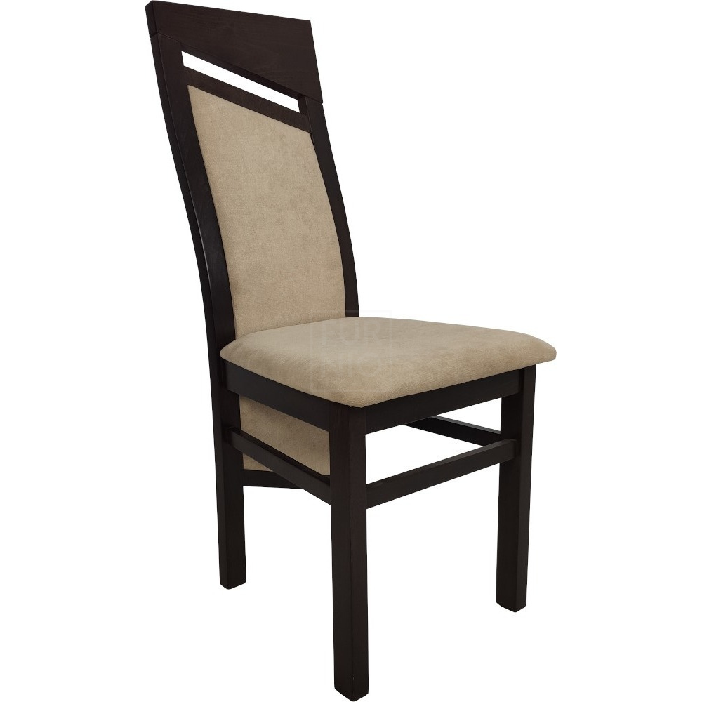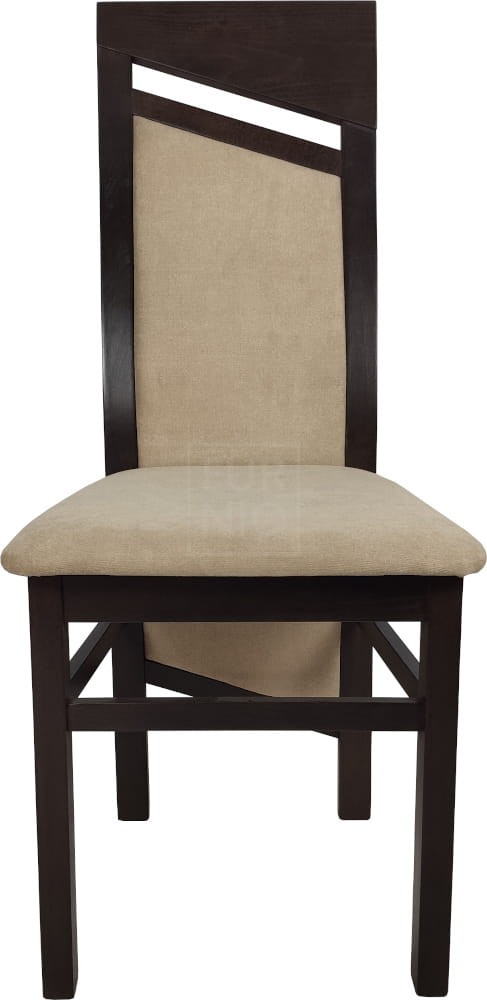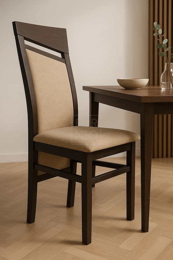 Stelaż wykonany z drewna bukowego, wykończonego bejcą i lakierem wodnym, co gwarantuje trwałość i solidność. Tapicerowane siedzisko i oparcie zapewniają komfort podczas użytkowania.
