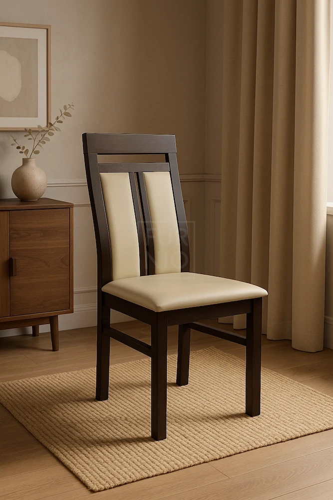 Krzesło wykonane jest z drewna bukowego, co zapewnia trwałość oraz stabilność. Tapicerowane siedzisko i oparcie dodają wygody, a solidna konstrukcja gwarantuje długowieczność.